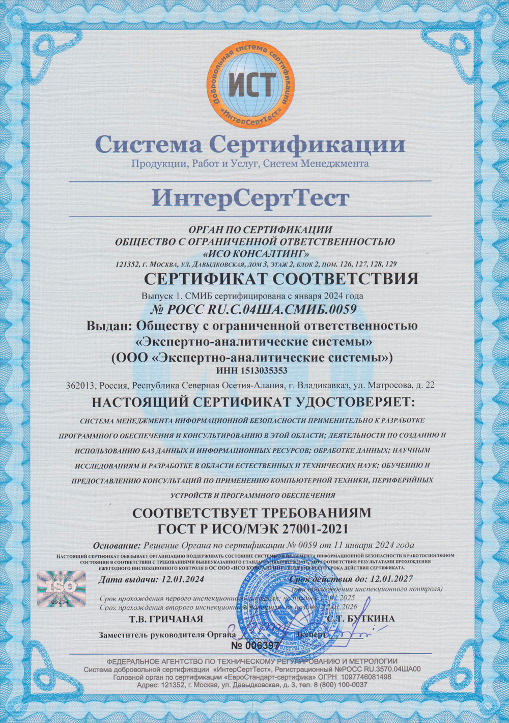 Соответствует требованиям ГОСТ Р ИСО/МЭК 27001-2021.