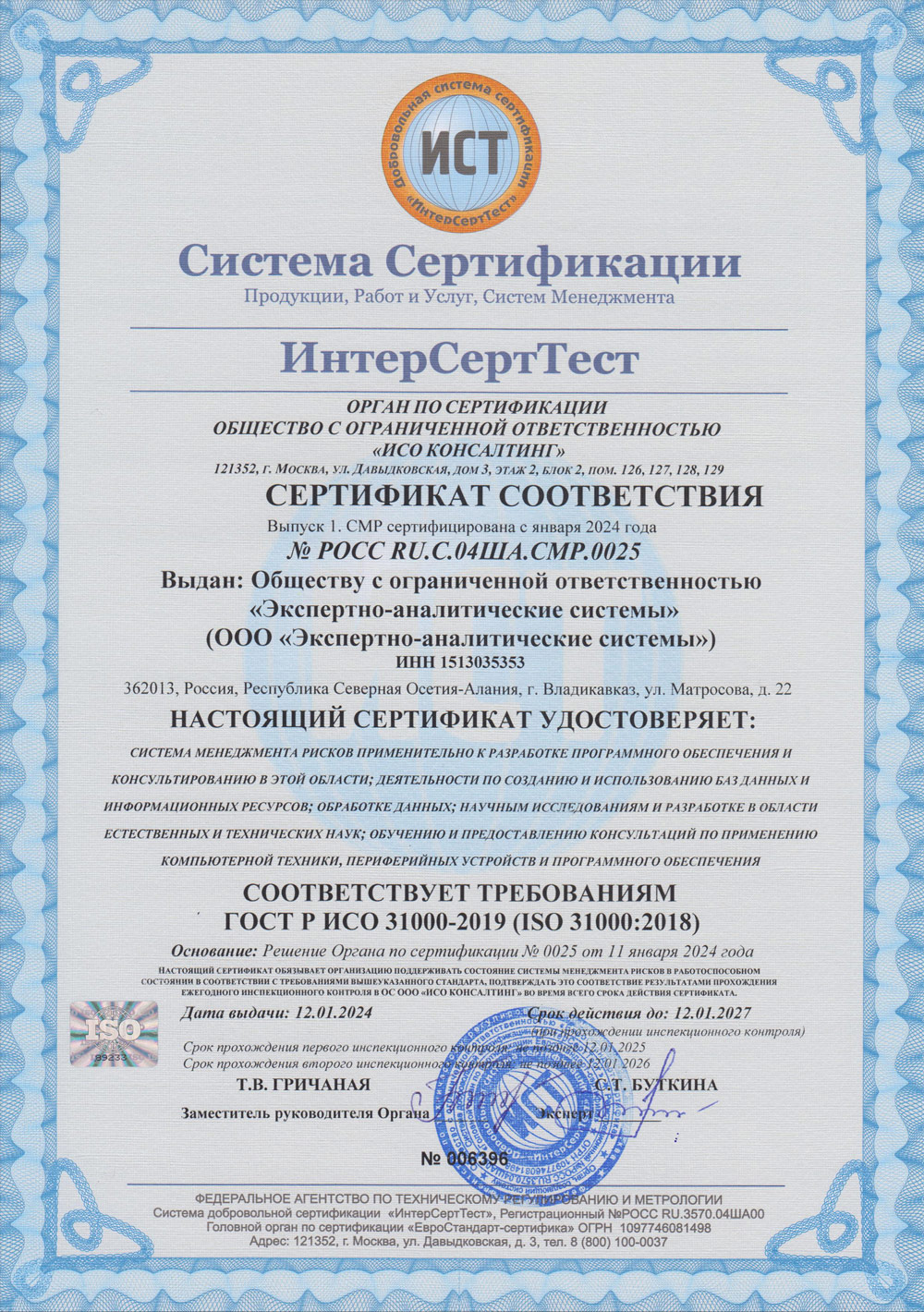 Соответствует требованиям ГОСТ Р ИСО 31000-2019 (ISO 31000:2018).